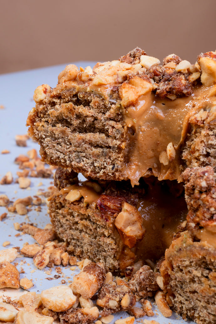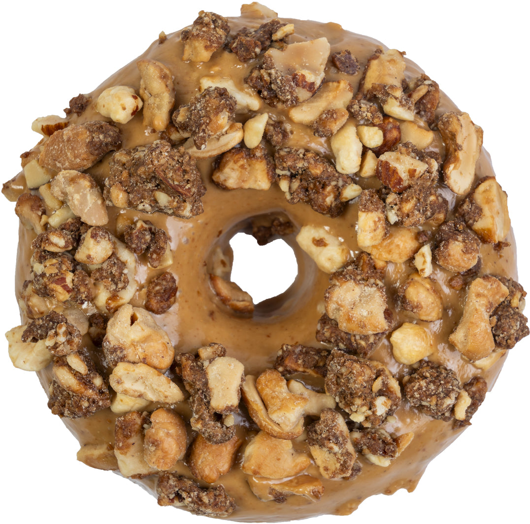 Cubierta de cremosa pasta de nuez de la India y una mezcla crujiente de trozos de galleta y nueces. Una explosión de textura y sabor en cada bocado.